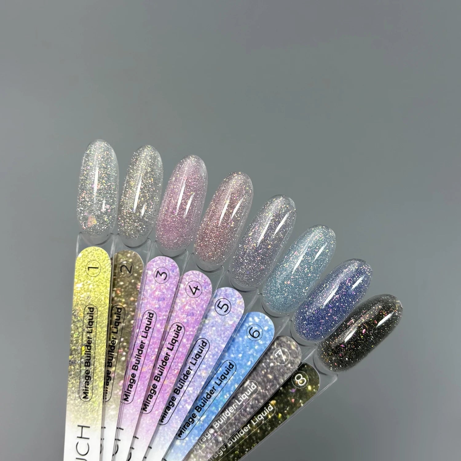 MIRAGE BUILDER LIQUID — symbióza stavebního gelu a krycí báze s reflexními částicemi, které vytvářejí světlo odrážející efekt. Na denním světle poskytuje jemný třpyt, pod umělým osvětlením vytváří hluboký zářivý efekt.